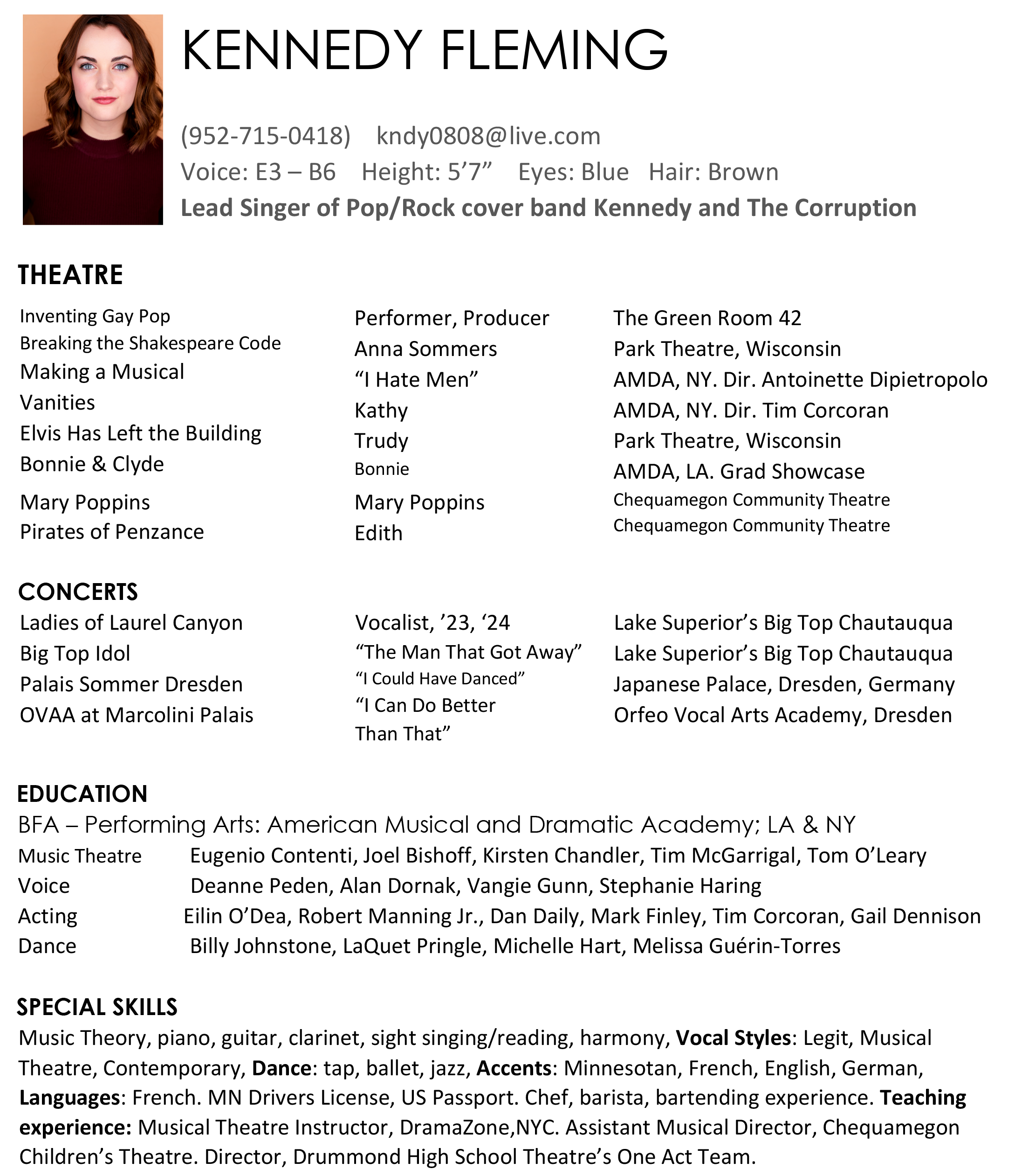 While waiting for the dust to settle on the COVID-19 pandemic, Kennedy returned to her second home of Cable, Wisconsin. As an educator, she was Assistant Musical Director for Chequamegon Children’s Theatre, and Director for Drummond High School’s One Act play festival (Gold Medalist, 2023; Outstanding Direction, 2021, 2023). As a musician, she was lead vocalist and keys in her pop/rock band Kennedy & The Corruption. As a solo artist, she was a lead vocalist in Lake Superior’s Big Top Chatauqua’s concert series Ladies of Laurel Canyon in 2023, and returned once more in 2024.
